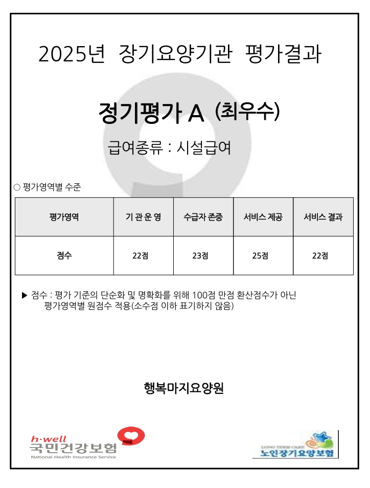 2025년도 국민건강보험공단에서 실시한 전국 장기요양기관(노인복지시설) 평가에서